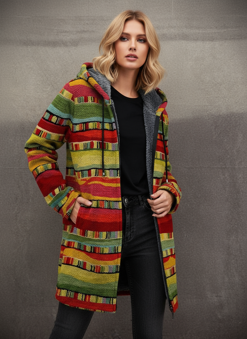 Chaqueta unisex de estilo artístico con diseño geométrico multicolor. Su corte holgado y capucha amplia la hacen ideal para un look moderno y cómodo, perfecta para quienes buscan una prenda original, cálida y con personalidad.