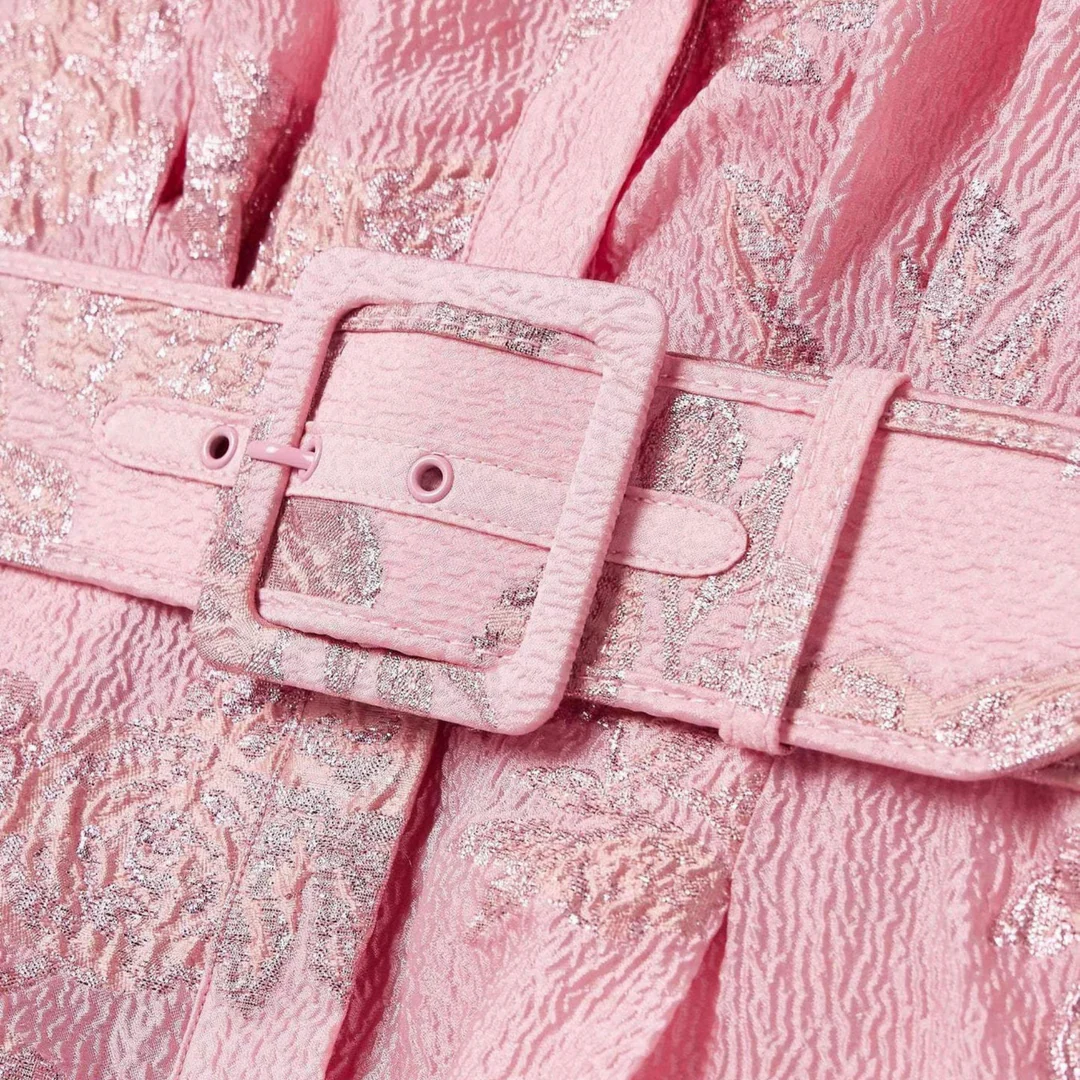 Vestido largo con vuelo en tono rosa empolvado, confeccionado con un tejido con textura floral en relieve. Su diseño con cuello camisero, mangas abullonadas y cinturón a juego estiliza la silueta aportando elegancia y feminidad. Ideal para eventos, bodas o celebraciones especiales.
