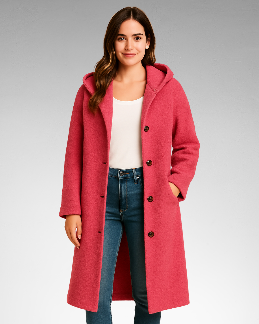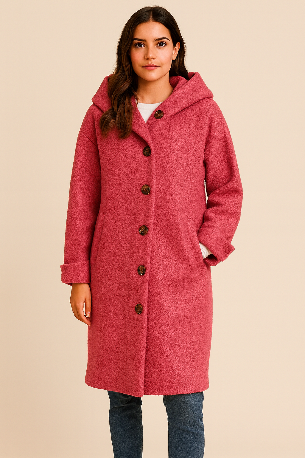 La Chiara es el abrigo ideal para quienes buscan comodidad, estilo y un toque femenino en los días más fríos. Su diseño largo con botones frontales y capucha aporta una silueta elegante y moderna, mientras que su tejido cálido y suave envuelve con una sensación acogedora.