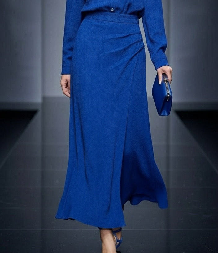 Inspirado en los conjuntos denim de alta costura, combina la sofisticación de una blusa camisera con la fluidez de una falda larga en un solo diseño impecable.