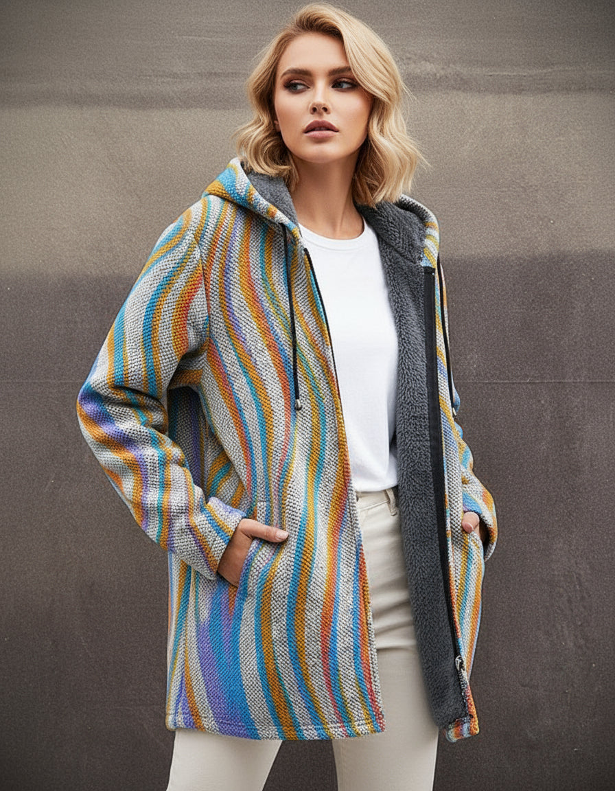 Chaqueta unisex de estilo artístico con diseño geométrico multicolor. Su corte holgado y capucha amplia la hacen ideal para un look moderno y cómodo, perfecta para quienes buscan una prenda original, cálida y con personalidad.