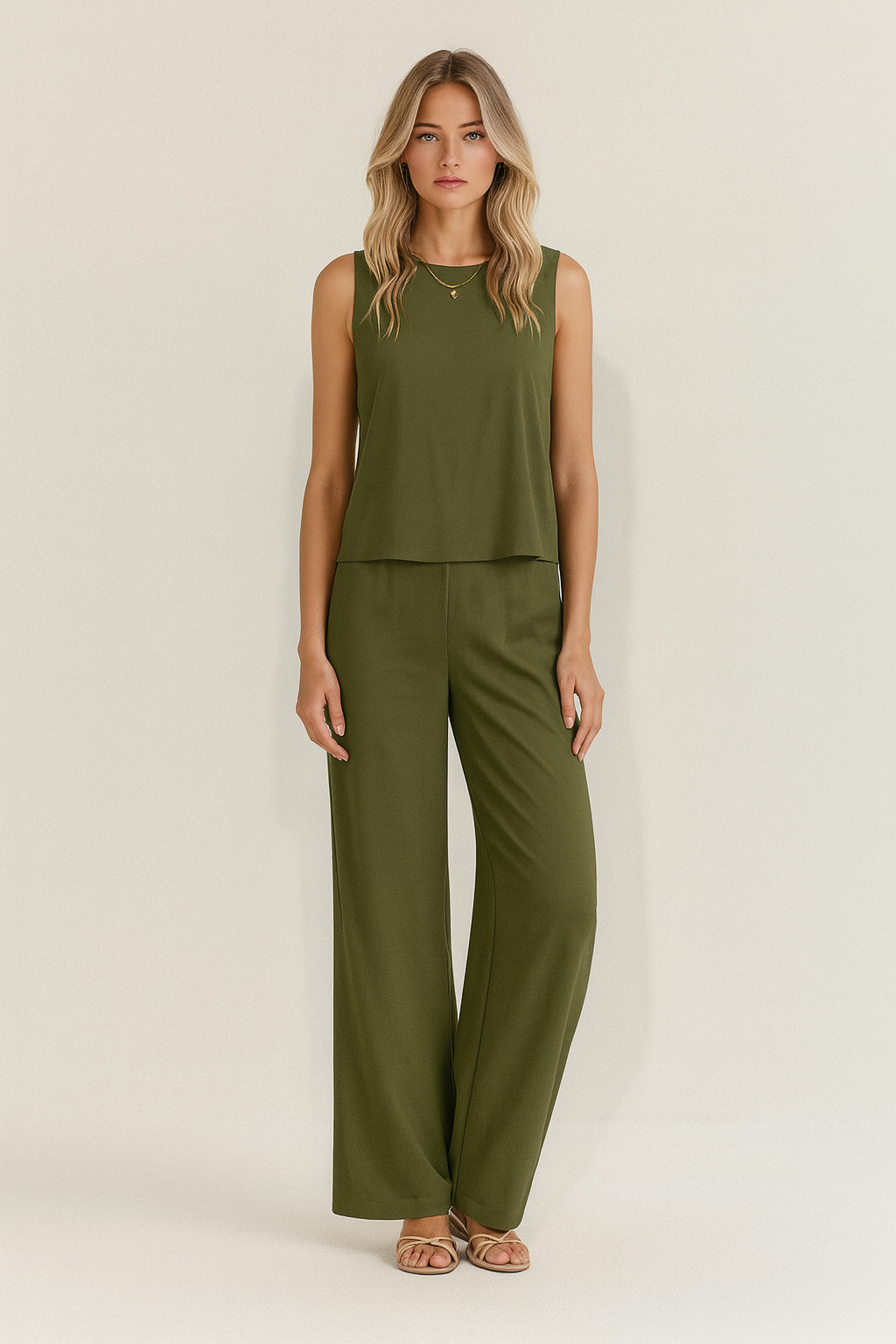 Conjunto dos piezas en tono mostaza: top sin mangas de caída recta y cuello redondo, y pantalón palazzo de tiro alto con pernera amplia. Un set limpio y elegante que alarga la silueta y funciona igual de bien para trabajo, eventos o looks minimal de día.