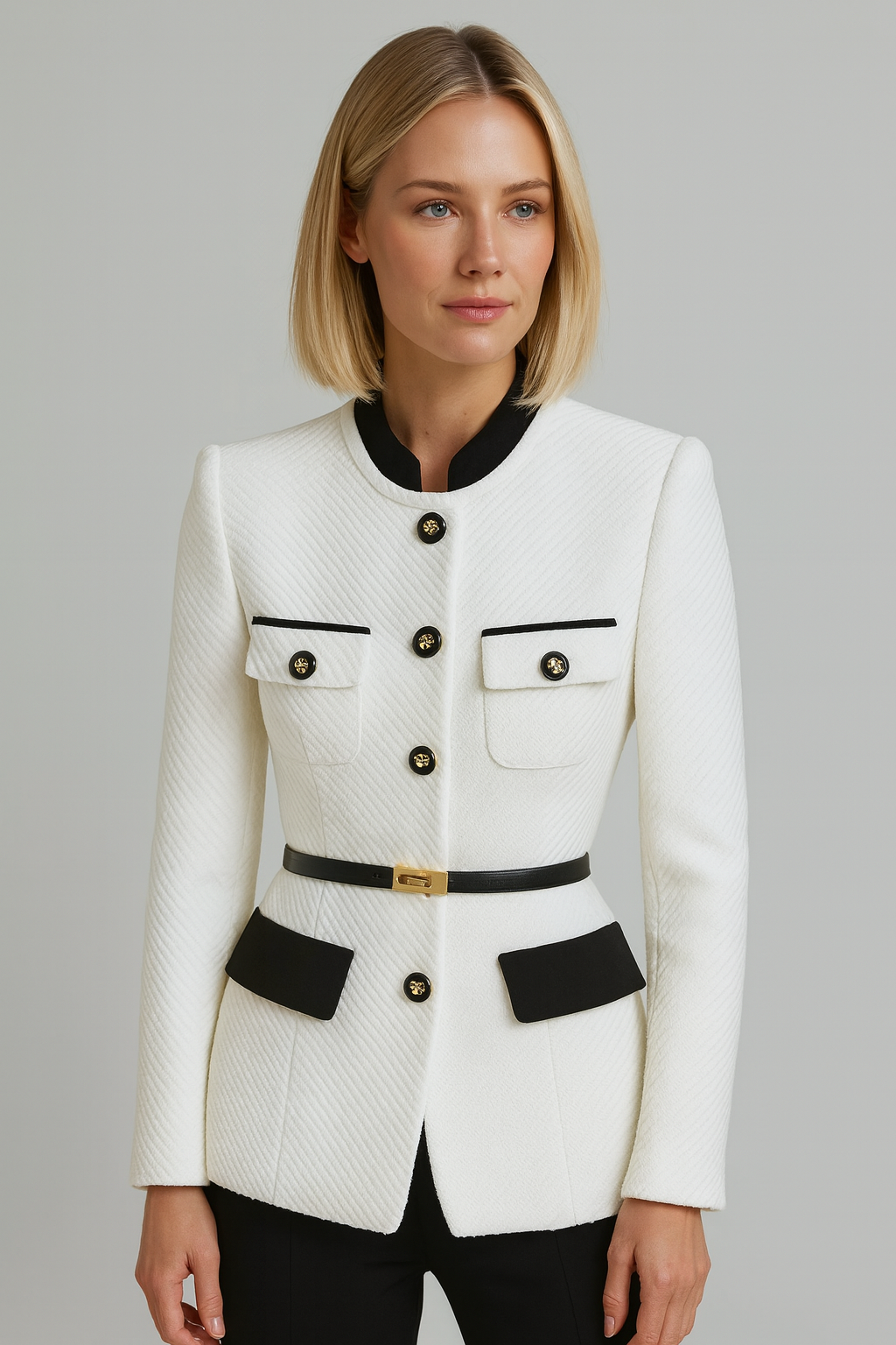Su estructura definida realza la silueta femenina, mientras los bolsillos de terciopelo negro y los botones dorados aportan un contraste de lujo.
