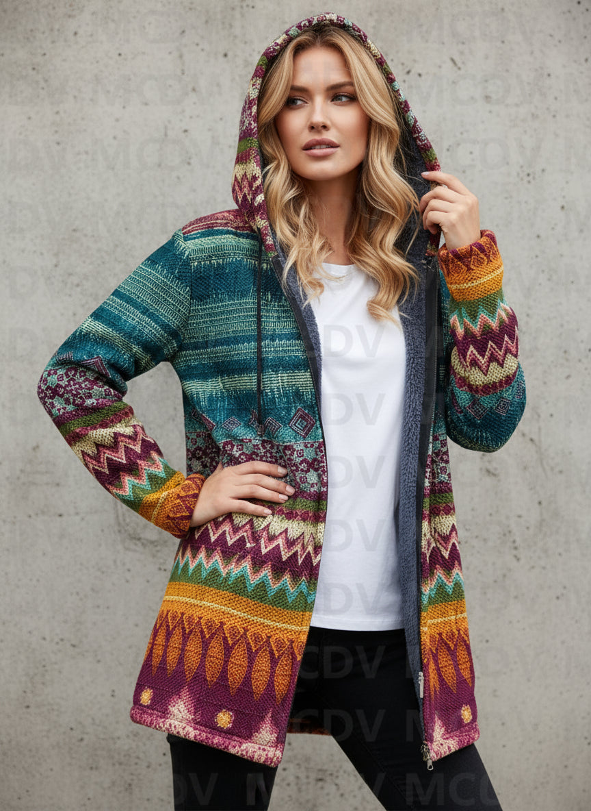 Chaqueta unisex de estilo artístico con diseño geométrico multicolor. Su corte holgado y capucha amplia la hacen ideal para un look moderno y cómodo, perfecta para quienes buscan una prenda original, cálida y con personalidad.