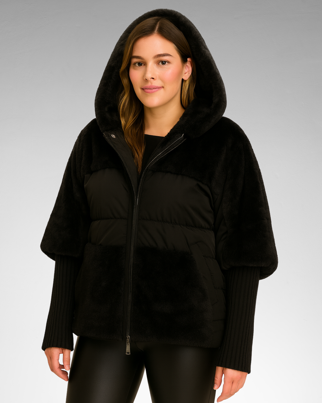 Abrigo corto de peluche sintético combinado con forro, con un acabado voluminoso y cremallera. Su textura suave y su diseño acolchado ofrecen calidez sin renunciar al estilo.