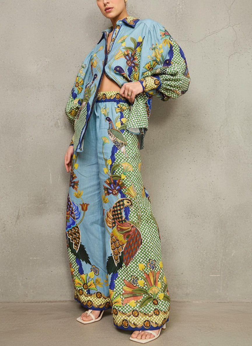 El Printed Blue combina elegancia, color y sofisticación con un estampado exclusivo que mezcla flores exóticas y aves imperiales en tonos intensos de azul, verde y dorado.