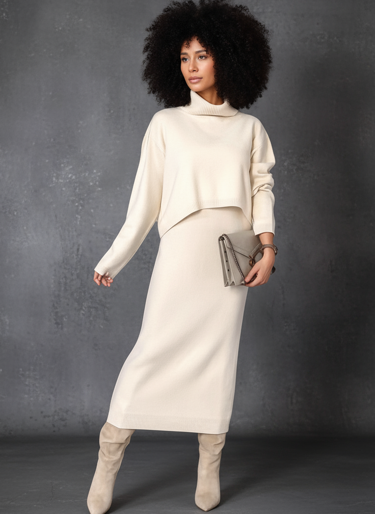 Confeccionado en un tejido de punto canalé premium, combina un suéter de cuello alto ligeramente oversize con una falda midi ajustada, creando una silueta estilizada y sofisticada.