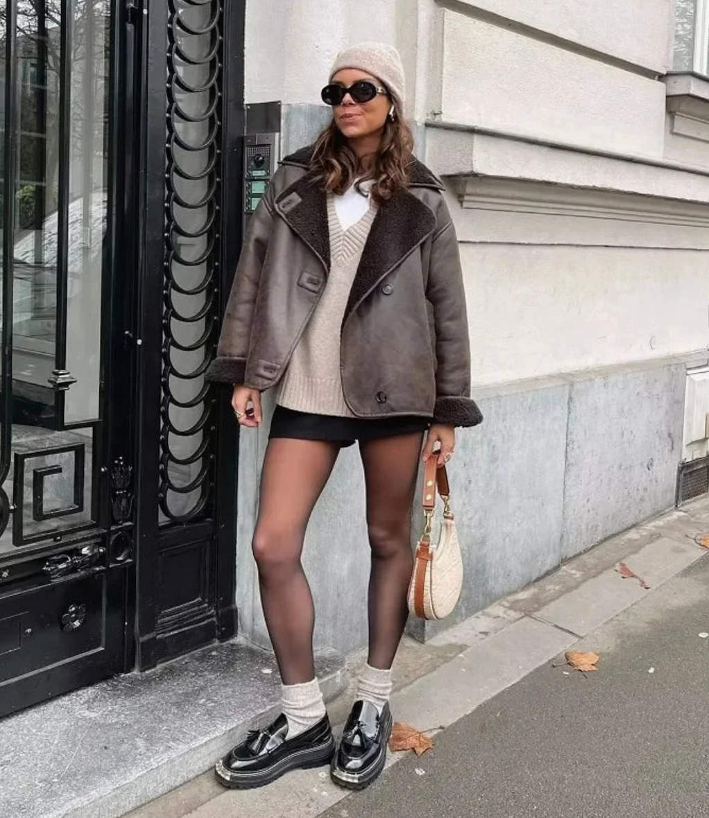 Los detalles en la solapa y bolsillos de borreguito negro añaden un contraste de lujo que eleva el look, manteniendo un estilo effortless y atemporal.